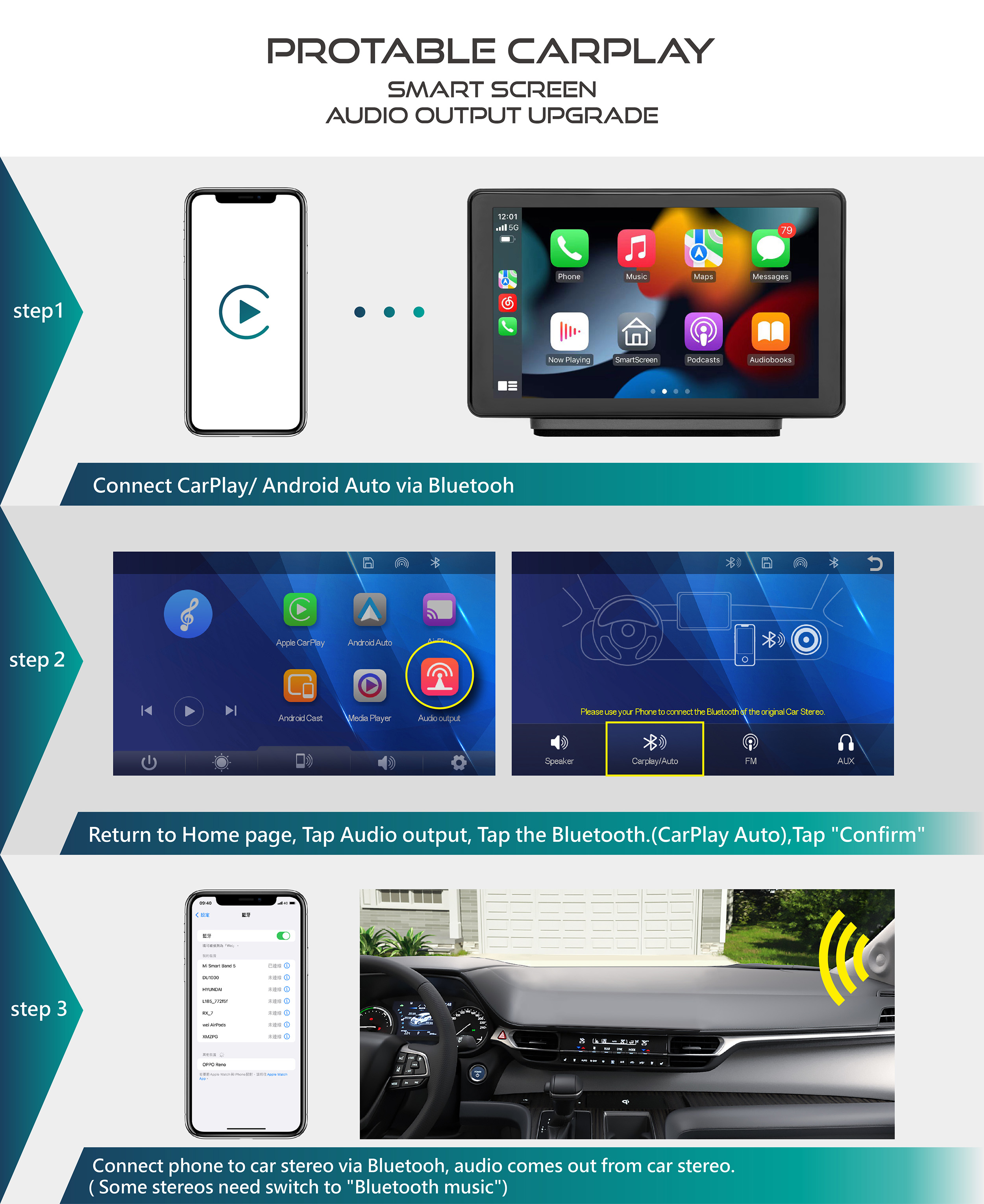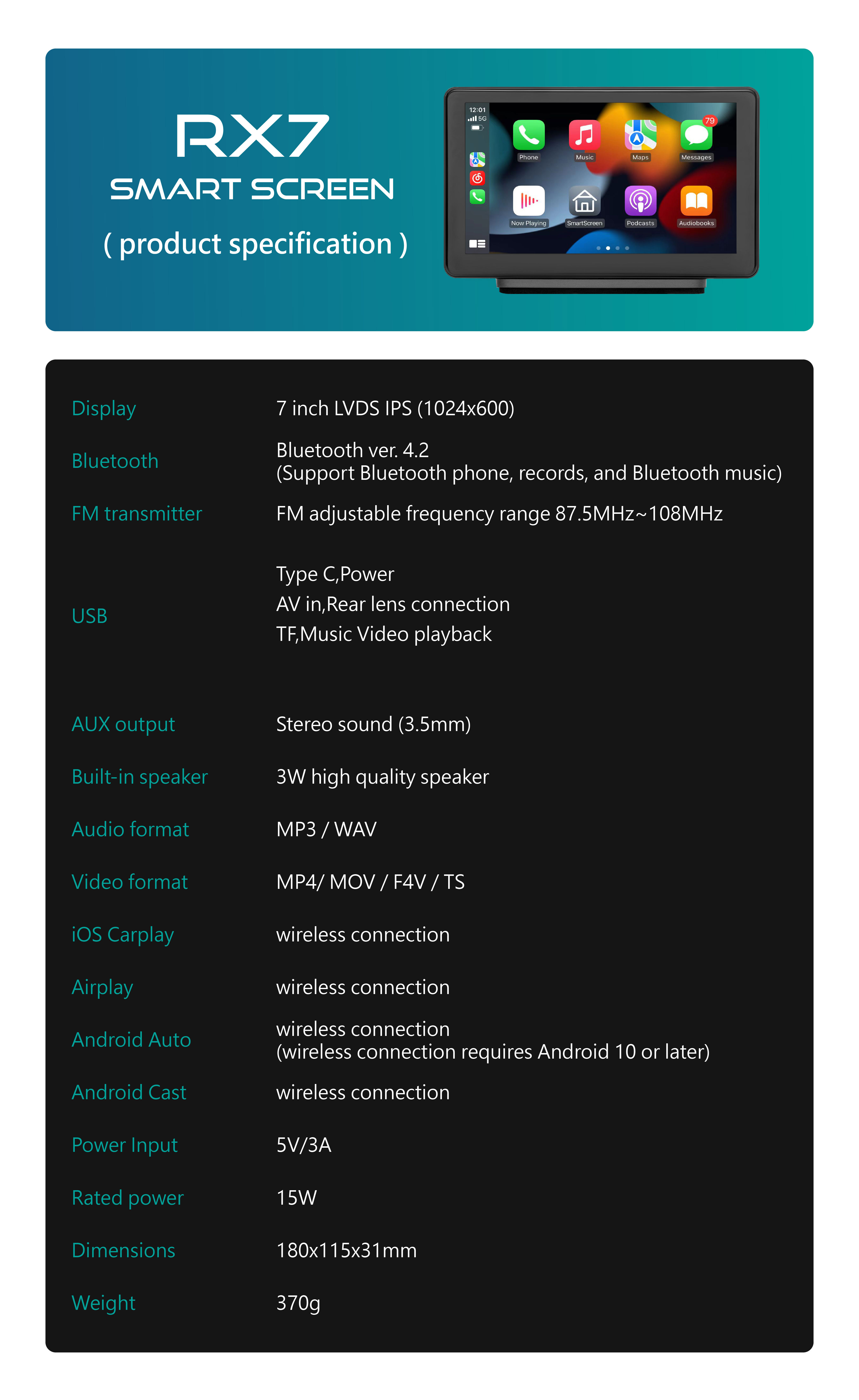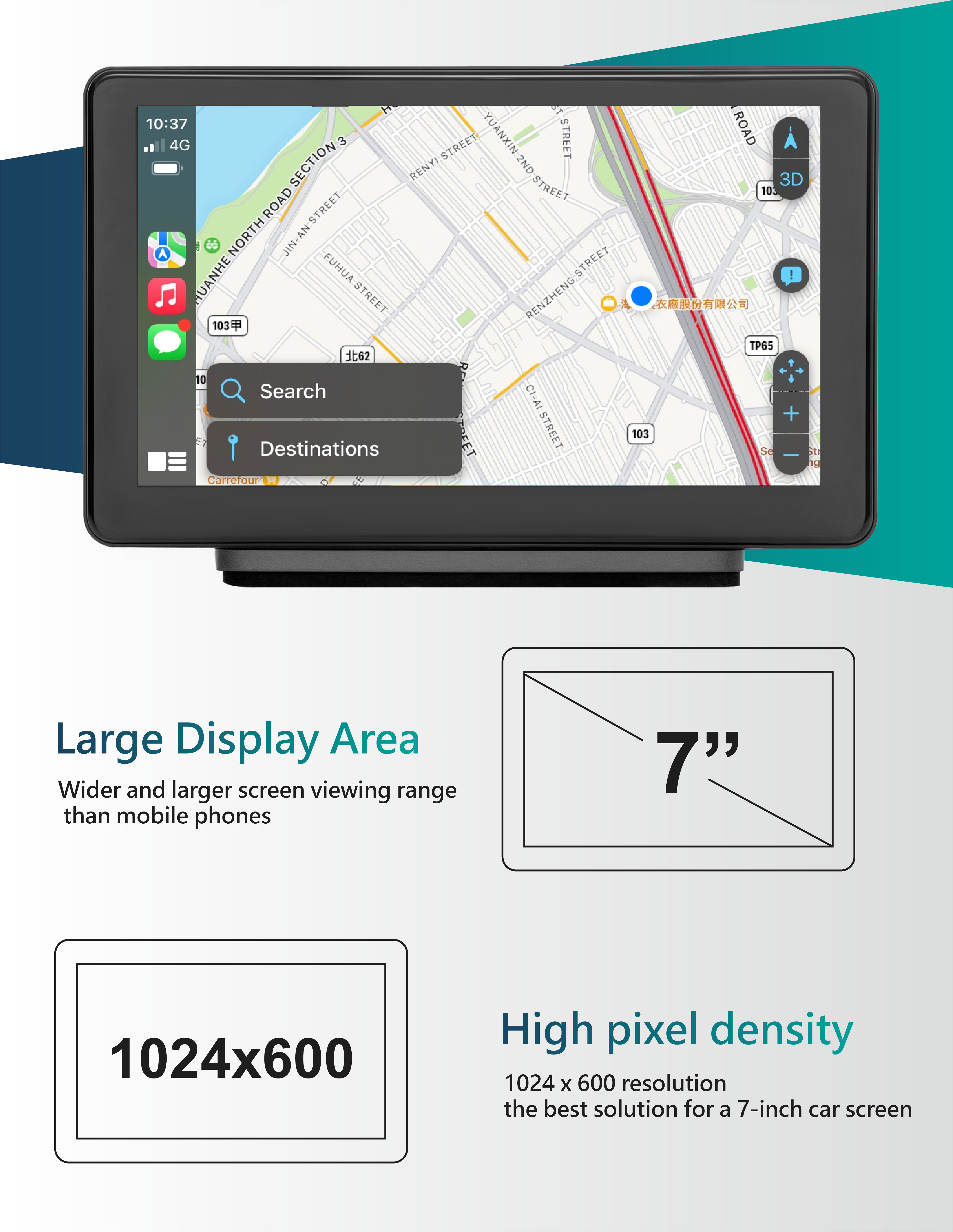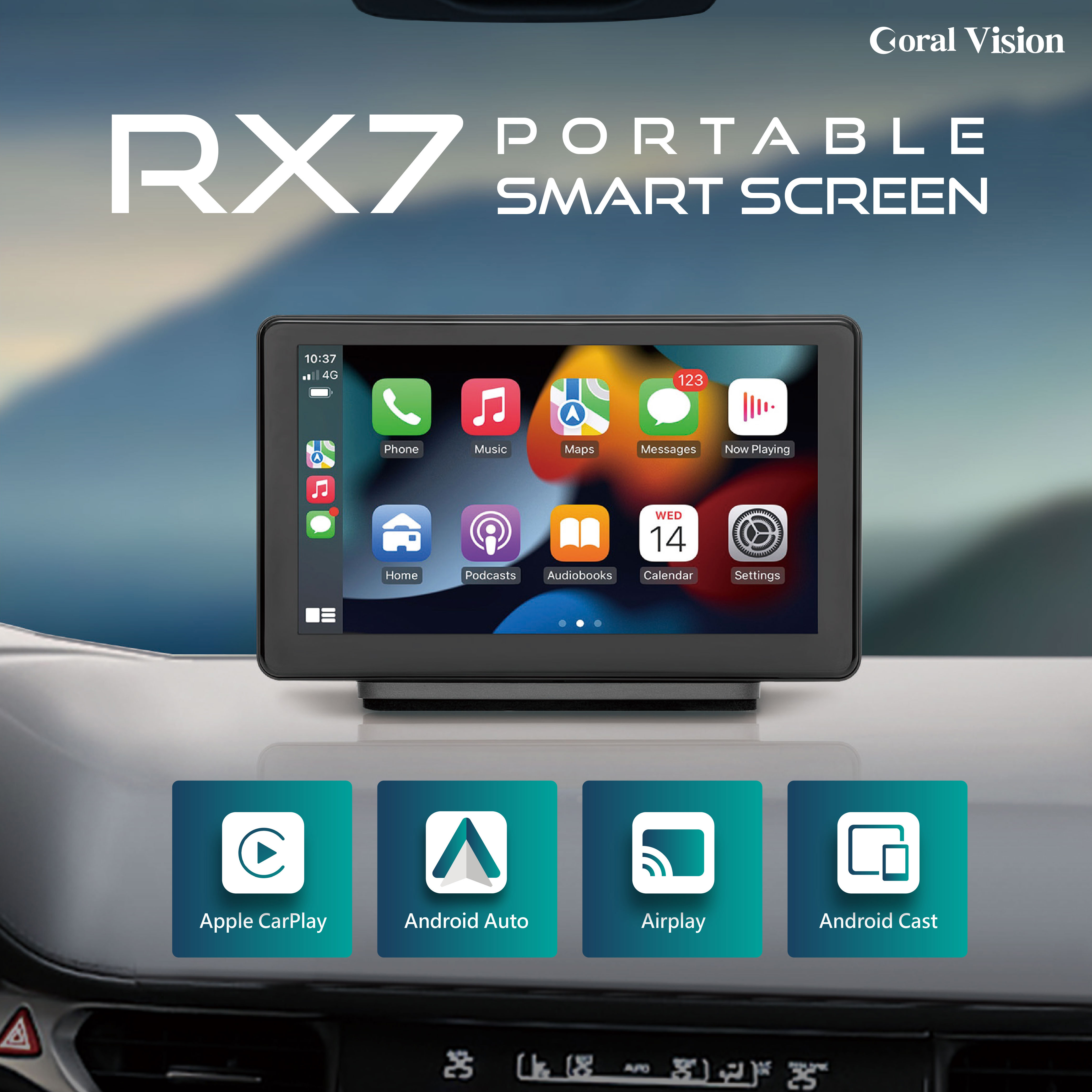 Coral Vision RX7 is a portable smart screen of CarPlay/ Android Auto and an infotainment system to extend the car console without the CarPlay/ Android Auto system. The machine supports not only wireless CarPlay/ Android Auto but also wireless mirroring functions (AirPlay, Android Cast). Its nondestructive installation design makes it easy to install.